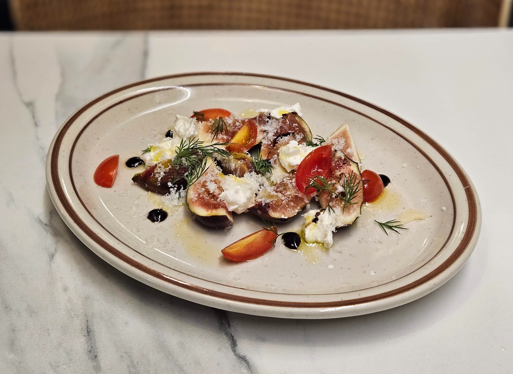 이날 식사는 뜻밖에 달콤함 덕분에 더욱 특별하게 마무리가 된 것 같습니다. 단골이라고 주신 서비스, 바로 무화과를 곁들인 샐러드가 마지막에 나왔거든요. 신선한 무화과의 부드럽고 달콤한 맛. 그리고 치즈와 방울토마토. 발사믹식초와 올리브오일을 곁들여 더욱 상큼하고 맛갈나는 디저트가 아닌가 합니다.