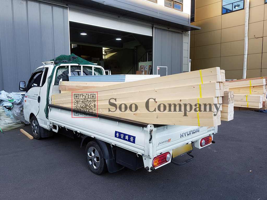 자재상차가 완료되었습니다. 판재를 먼저 적재한 이후에, 각재를 옆에 끼워넣는 방법으로 상차를 진행했는데요. 철물은 바 묶을때 아래에 내려서 상차하신다고 하시더라구요 ㅎㅎ 라왕각재의 경우, 보통 한묶음에 15~20개정도 묶여있는데, 라왕각내는 낱개로도 판매가 가능하기때문에, 필요하신량만 발주해주시면 됩니다. 라왕각재는 저희가 보통 수요가 예측되는 부분에서만 재고를 두기때문에, 품질이 좋습니다.