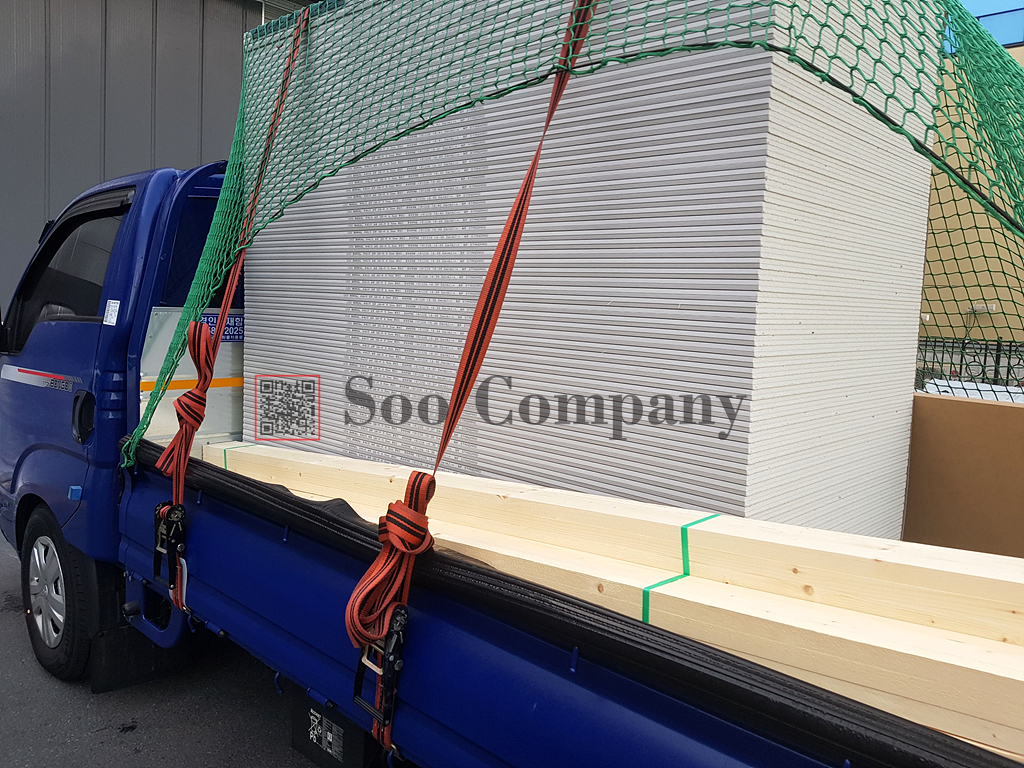 그리고 용달차기사님들께 항상 이야기를 드리지만, 1번들을 싣고 나가실때는 꼭 앞뒤로 상차해달라고 요청을 하고 있답니다. 물론 직접 수령하러 오시는 분들께도 이야기를 드리는 내용입니다!! 석고보드외 여러 판재류들을 상차할때, 적재함 위까지 자재가 올라간다면 바람에 의해 앞에 부분이 꺾여서 뜯겨나가는 경우가 가끔 있다고 합니다!! 석고보드는 100프로라고 보시면 됩니다...