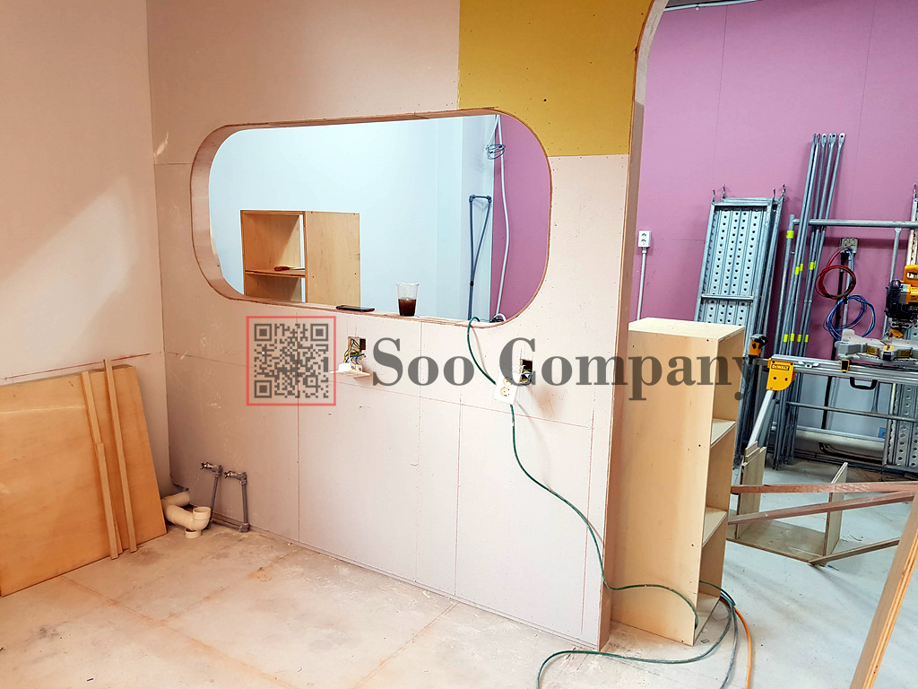 내부 제빵실쪽 아치게이트와 아치창입니다. 직선은 인간의 선이고 곡선은 신의 선이라는 이야기가 있듯이, 곡선으로 작업하는것이 정말 아름답다고 많이 느껴집니다. 곡선의 경우에는 오징어합판이라고 불리우는 요꼬합판이나, 3미리 mdf로 작업을 하는것이 일반적입니다.