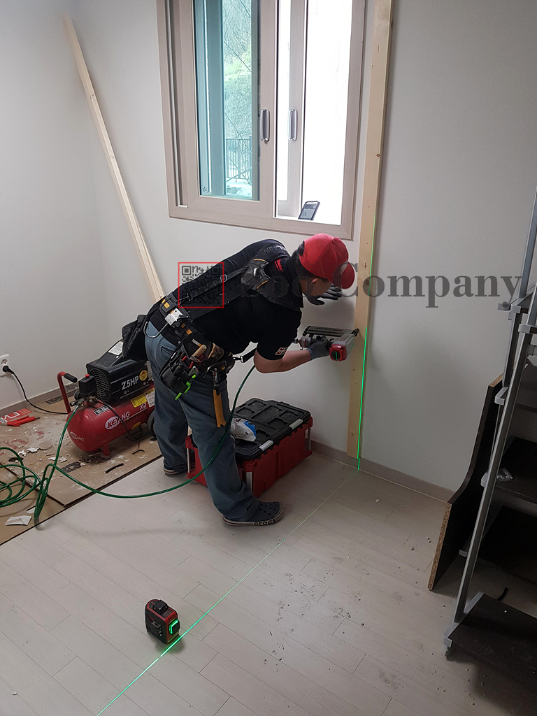 반장님의 연장차에는 사다리가 너무 큰것만 있어서 공구박스를 이용해서 높은곳의 각재를 박아줍니다. 큰 사다리로 작업을하면 이동할때 주변벽체에 상처를 낼 수 있기에 조심해서 하신다고 하시더라구요. 정말 배보다 배곱이 더 커질 수 있는 상황이라고 합니다. 마감이 되어있는곳이라서 신중하게 진행합니다.