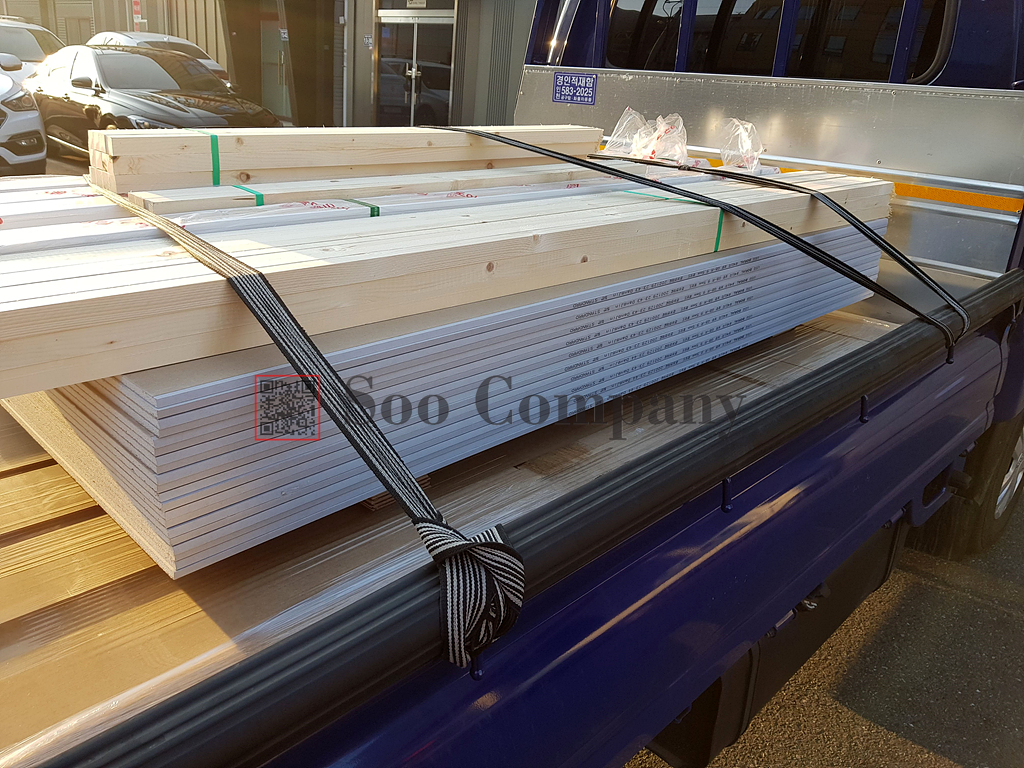 세번째 출고제품은 영림 중백색 몰딩과 건조다루끼, 석고보드, MDF재단품이 출고 되었습니다. 각재의 경우에는 엘리베이터로 양중을 하는 현장이기때문에 2400으로 절단을 해 드렸으며, MDF의 경우에는 원하시는 치수대로 재단해서 출고를 도와드렸습니다.