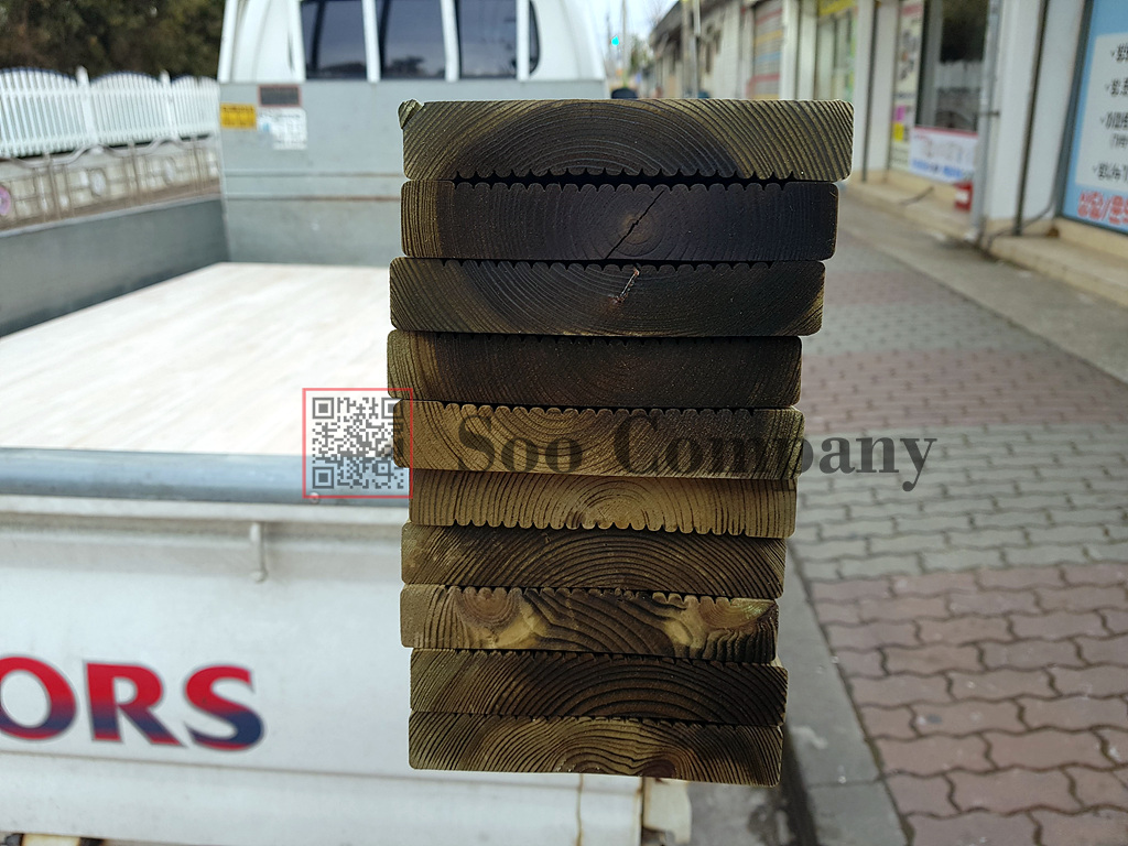 방부목 데크재 입니다. 일반적으로 보던 제품이랑은 조금더 얇고 작지요? 19*95치수의 제품입니다. 제크재로도 사용하지만, 벽체마감용으로도 많이 사용하고 있는 제품입니다.
