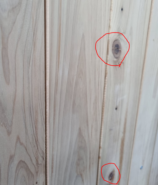 위의 사진이 히노끼루바인데요, 빨간색의 동그라미 부분을 옹이라고 합니다! 어디선가 본 모양이지요, 목재에서는 저 부분이 보이면 유절, 안보이면 무절이라고 합니다!