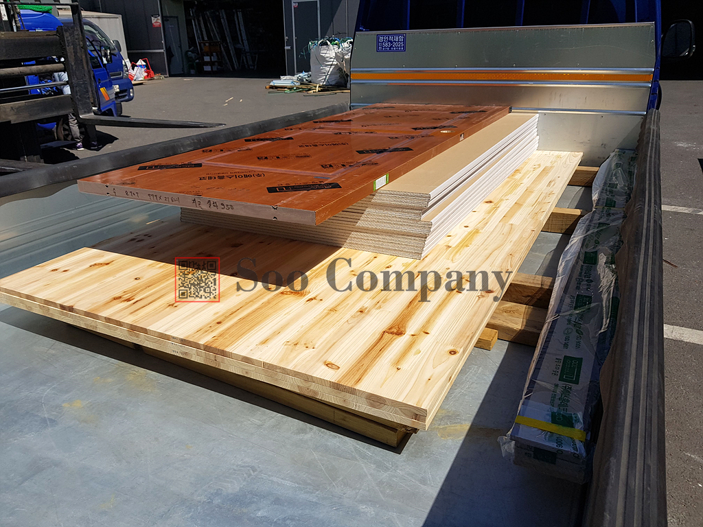 용달차에 상차가 완료되었습니다. 삼나무집성판과 석고보드 그리고 도어가 보이는군요! 삼나무집성판의 경우에는 연질의 집성목으로, 탑핑거조인트와 솔리드 제품이 나오며, 연질이고 히노끼와 비슷한 향이 나는것이 특징입니다. 유절제품으로 출고가 진행되며, 두께별로 단가의 경우에는 유선으로 문의주시기 바랍니다.
