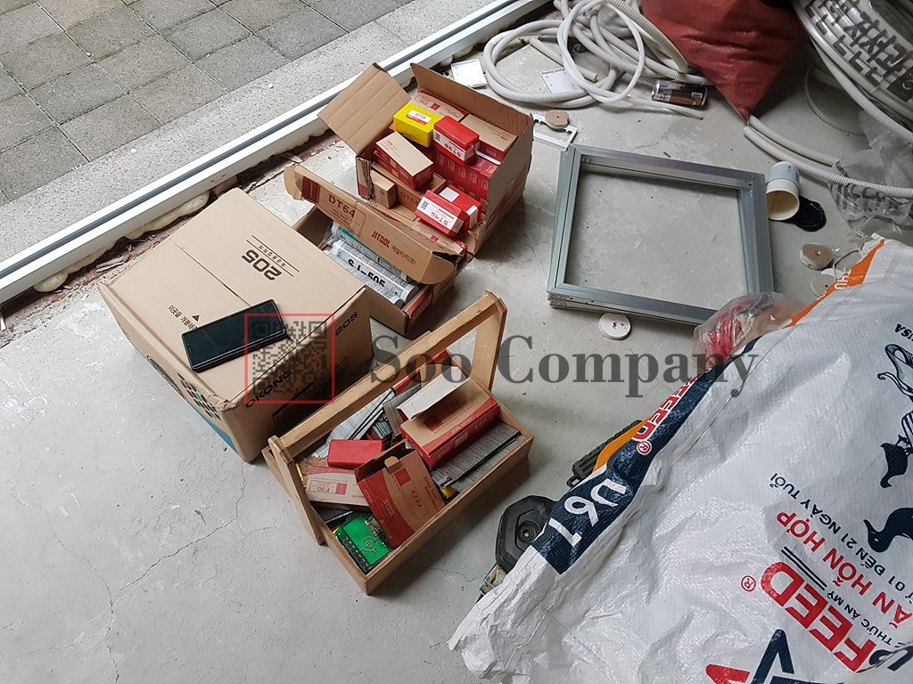 툴박스와 공구들입니다. 아직 공구를 다 하차하지 않은 상태라고 하시는데, 밀워키 제품을 선호하시는 정렬적인<?>반장님입니다. 요즘 유행하는 히든도어도 전문적으로 하시니, 궁금하신점 있으시면 유선으로 문의주시기 바랍니다.