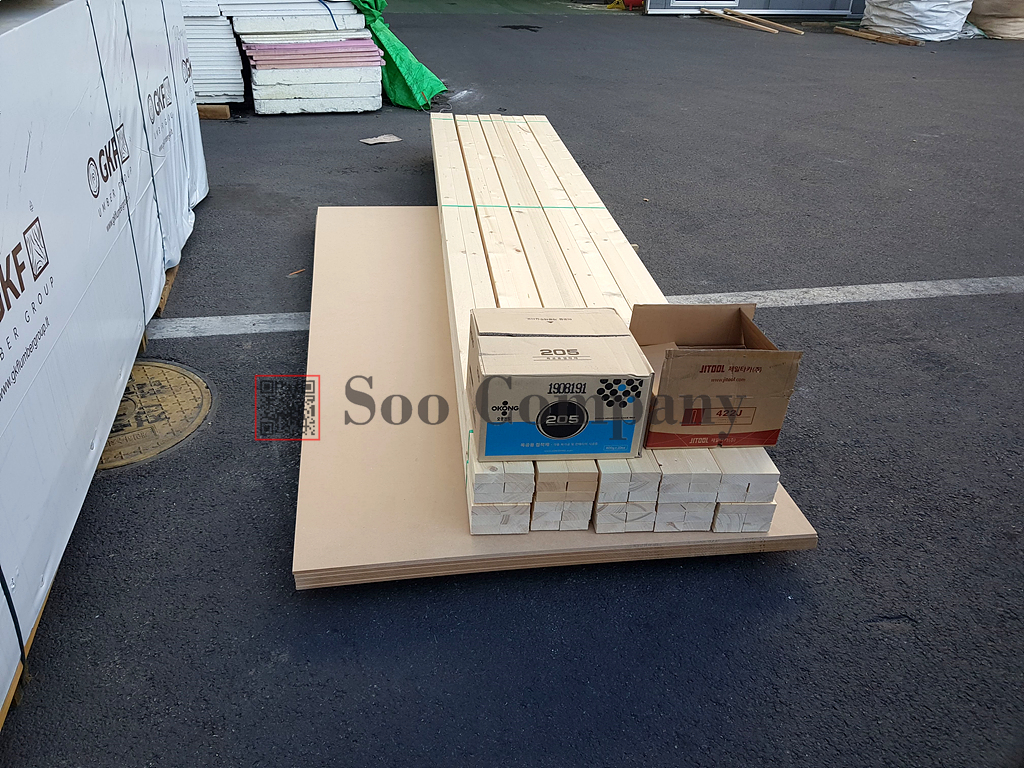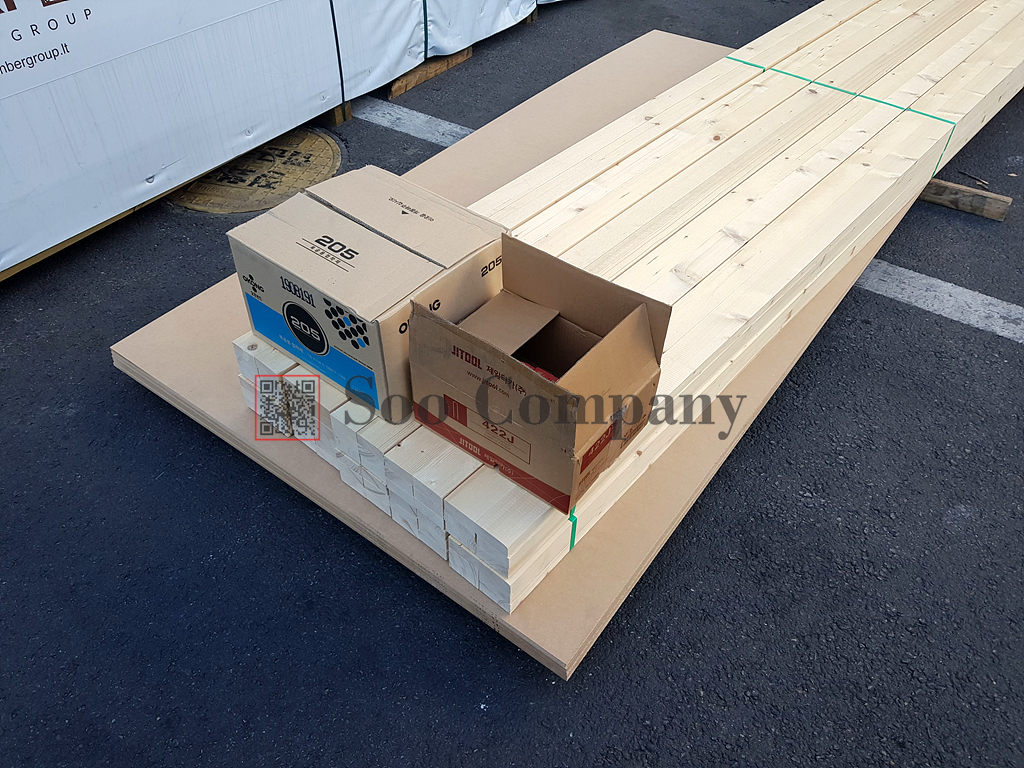 두번째 출고되는 자재는 MDF판재와 철물, 그리고 소송각재가 준비가 되었습니다. 소송다루끼와 투바이의 경우에는 내장용으로 많이 사용되는 제품으로, 예전에는 미송제품을 많이 사용했었는데, 무게도 더 가볍고, 연질인 소송각재를 요즘에는 많이 사용하고 있는 추세입니다.