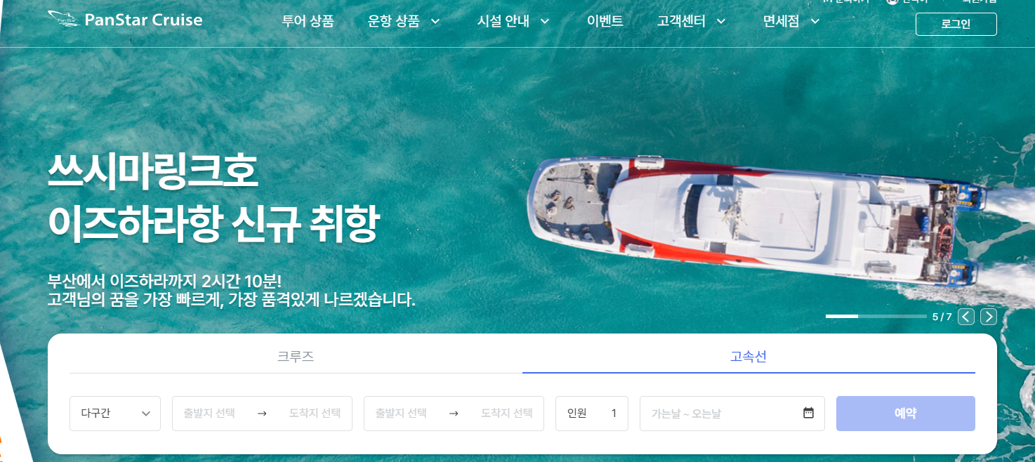대마도에 가기 위해선 여러 배편이 있으며, 그 중에서도 팬스타 크루즈와 스타라인이 가장 많이 이용된답니다. 예약은 홈페이지나 오픈마켓을 이용해서 간편하게 할 수 있습니다. 팬스타 크루즈의 예약 페이지를 방문하면 아래의 홈페이지로 접속하게 됩니다. 여기서 크루즈가 아닌 고속선으로 선택하셔야 합니다!