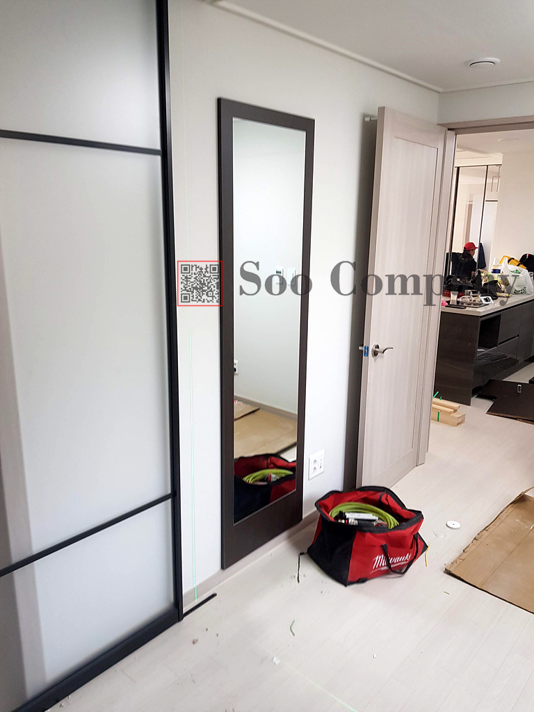 공구도 세팅을 하고, 레이져를 이용해서 벽 마감선 위치를 잡아줍니다. 마감하는곳에 도어 레일이 걸려, 문이 이전처럼 100%열리지 않는것을 안내드리고 진행하시는거라고 하시더라구요! 행거도어의 경우에는 스토퍼를 조절할 수 있기때문에, 큰 문제는 되지 않는다고 합니다.