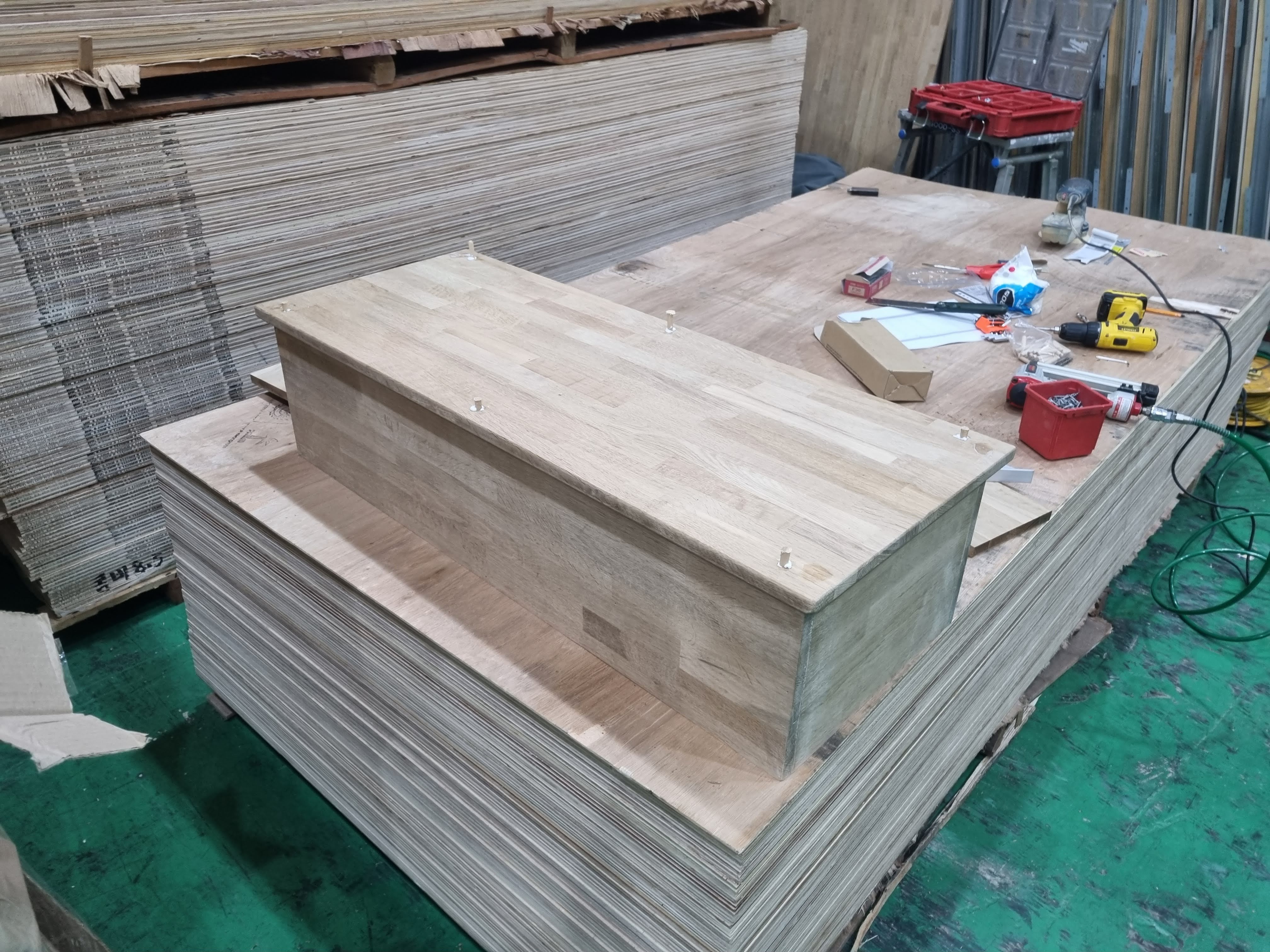 이제 조립을 진행합니다. 하판을 먼저 조립을 하고, 그위에 상부판을 얹혀 작업을 완료하고 있는 사진이 보이네요 ㅎㅎ 개인적으로 본드칠을 한 후에 타카로 조립을 해도 괜찮다고 알고 있지만, 저는 꼭 이중기리를 이용해서 천공을 하고, 피스로 결속 후 목다보로 마감을 하고 있습니다.
