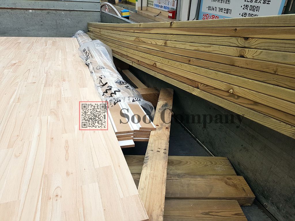 이번 데크재의 경우, 보수작업으로 하시는것이기도 하지만, 19*95제품이기때문에, 이번은 방부목으로 납품요청을 해 주셨습니다! 그리고 요즘에 참죽집성판으로 가구를 만들어서 납품을 하시기 시작하셨는데, 반응이 정말 좋다고 하시네요! 스터디카페에도 메인자재로 사용할만큼 가성비와 나뭇결이 좋은 제품이니, 가구제작을 염두해두셨다면 한번 생각해보시는것도 좋을것 같습니다.